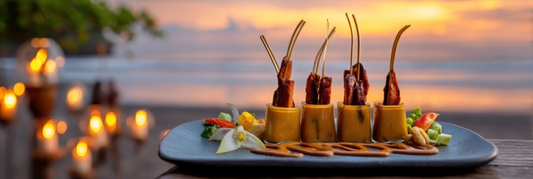 Airborne peanut satay skewers with peanut sauce arcs on a softly blurred Bali beach bar backdrop under vibrant sunset light