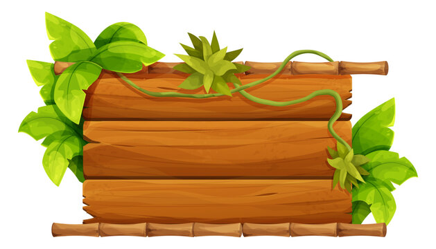 Bamboo frame with empty wood planks, jungle leaves and vine. Themed projects game ui border, menu. Old paper textured, bamboo border.