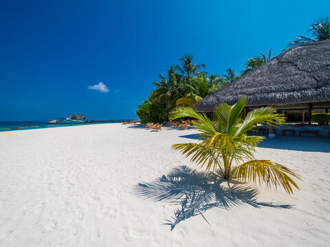 Maledives, Ross Atoll, beach bar and sandy beach with palms