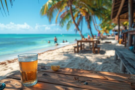 Tropical beach bar background. Wooden table top with blurred background of beach bar, perfect for product placement or summer theme design.