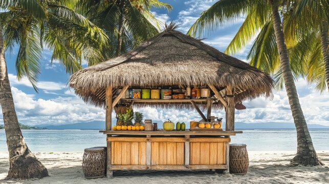 Tropical beach bar with fresh fruits and drinks under a thatched roof