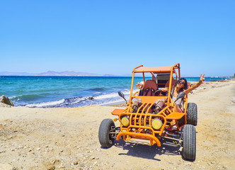 A happy girl driving a Buggy on a dune of beach with the Aegean sea in background. Greek island of Kos. South Aegean region, Greece.