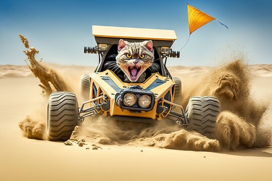 Crazy cat driving dune buggy on the sandy beach illustration generative ai