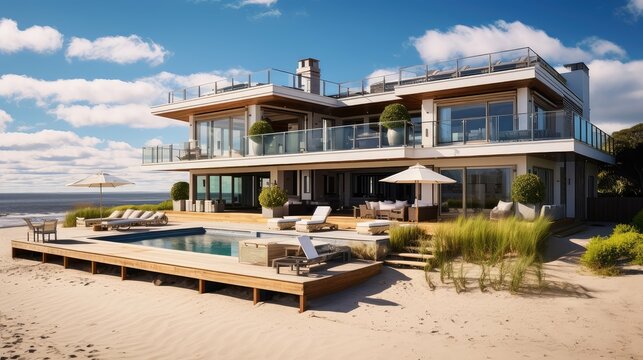 Beach Cabanas and Bungalows Design a pattern featuring colorful beach cabanas and bungalows nestled along the shore Add details like lounge chairs, umbrellas