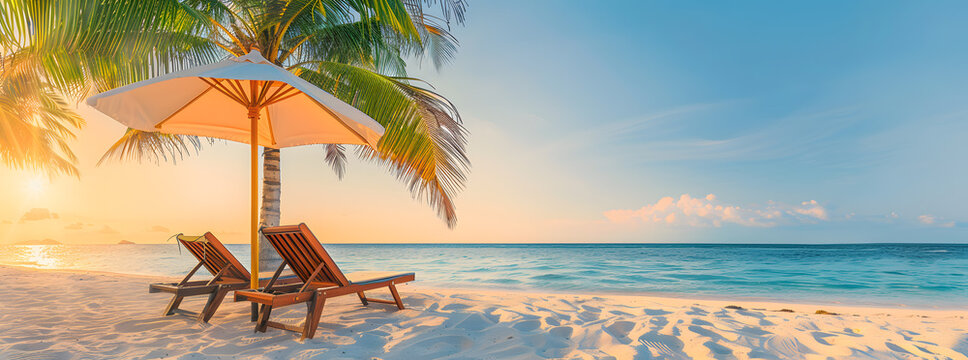 Beautiful tropical beach banner. White sand and coco palms travel tourism wide panorama background concept. Amazing beach landscape