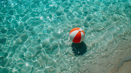 top view of a beautiful white and red ball on the blue water of the sea near the shore on a beach where there is no one, associations with recreation on the water and various activities