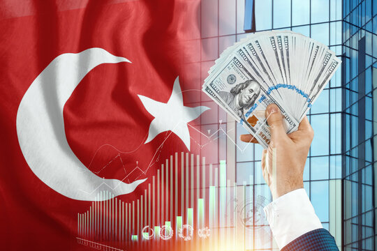 Money in a man's hand against the background of the flag of Turkey. Income of the Turks. Financial condition of residents of Turkey, taxes, loans, mortgages. State debt of the country.