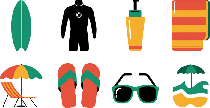 Beach vacation essentials vector illustration summer holiday items and travel accessories design set icon editable stock vector illustration