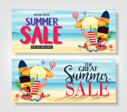 Vibrant summer sale banners featuring beach scene with surfboards umbrellas and beach chairs