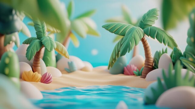 Idyllic cartoon beach scene with palm trees, sand, and ocean.