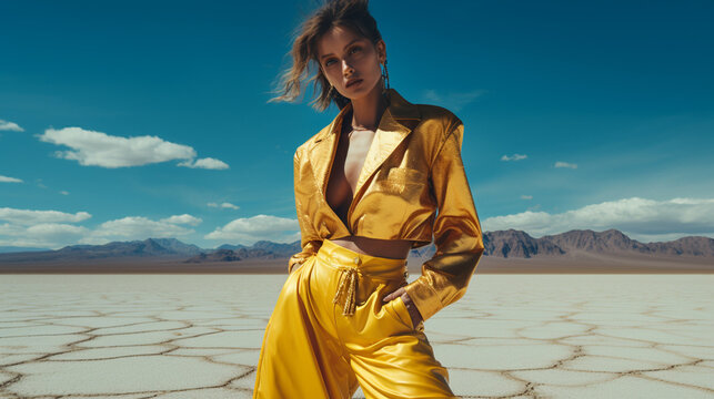 Fashionable woman in stylish sleeveless attire outdoor portrait