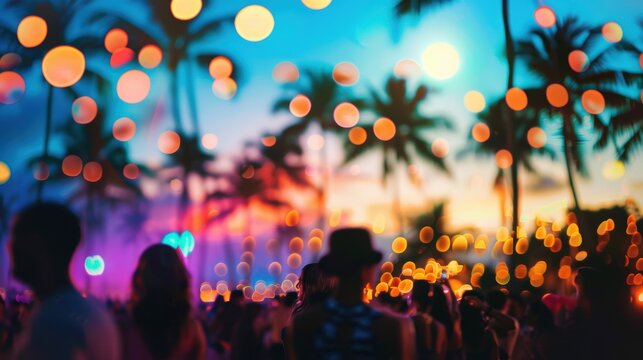 Vibrant outdoor festival scene with colorful lights, palm trees, and a crowd of people enjoying the evening.