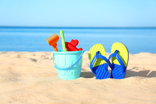 Beautiful view of sand with plastic beach toys and flip flops near sea on sunny day