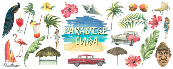 A large set on the theme of the paradise country of Cuba. There are many different objects, watercolor hand-drawn. For decoration, design and composition.