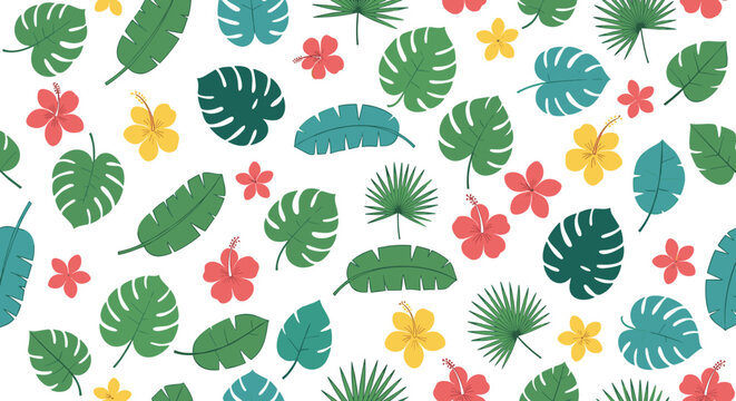 Vibrant tropical foliage and hibiscus flowers create a lively, seamless pattern, perfect for summer designs and exotic themes.