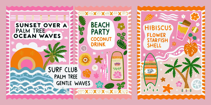 Colorful illustrated postcard set featuring tropical themes and summer vacation elements