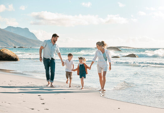 Group, running and friends with vacation, beach and smile with weekend break, bonding or getaway trip. People, men or women with holiday, seaside or summer with journey, freedom or adventure with joy