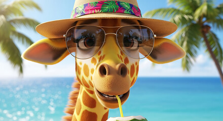 A smiling cartoon giraffe wearing a summer hat and sunglasses on a tropical beach vacation.