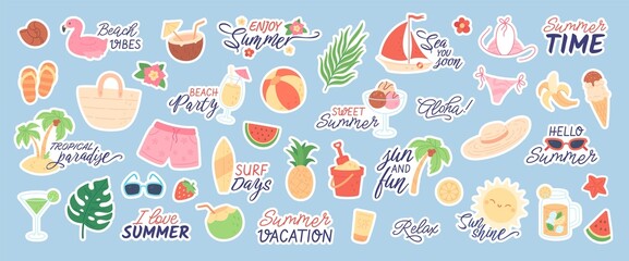 Cartoon set of summer with icons and stickers. Collection flat elements for vacation, beach holiday, weekend and summer time concept. Hand drawn items, signs for daily planner, scrapbooking, print