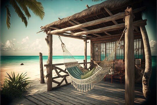 a hammock hanging from a wooden structure on a beach with a view of the ocean and a beach hut with a hammock.  generative ai