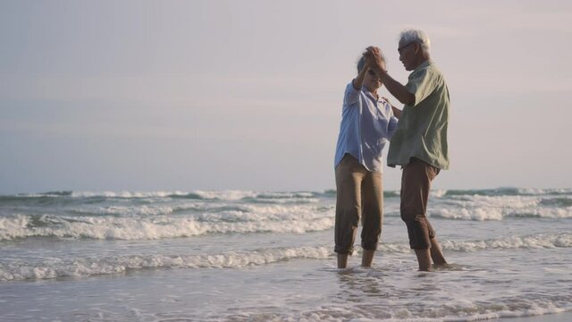 Asian couple senior elder retire resting relax dancing at sunset beach