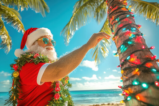 Santa claus is getting ready for a tropical christmas, decorating a palm tree with colorful lights on a sunny beach