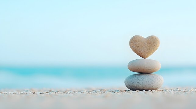 A tranquil scene featuring a minimalist arrangement of two heart shaped stones on a serene beach with gentle waves and a calming backdrop of the ocean  This image evokes a sense of harmony romance