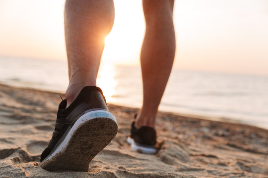 Feet, runner and tie shoes at beach for running, workout and fitness performance. Closeup, hands and athlete lace sneakers, footwear and prepare on sand at sea for exercise, sports or summer training