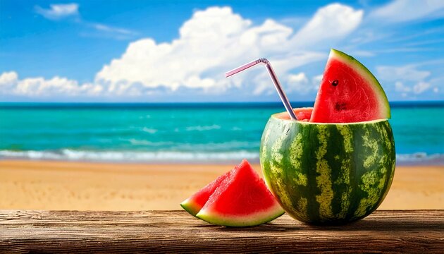 watermelon juice in watermelon rind, no glass cup, beach background, copy space