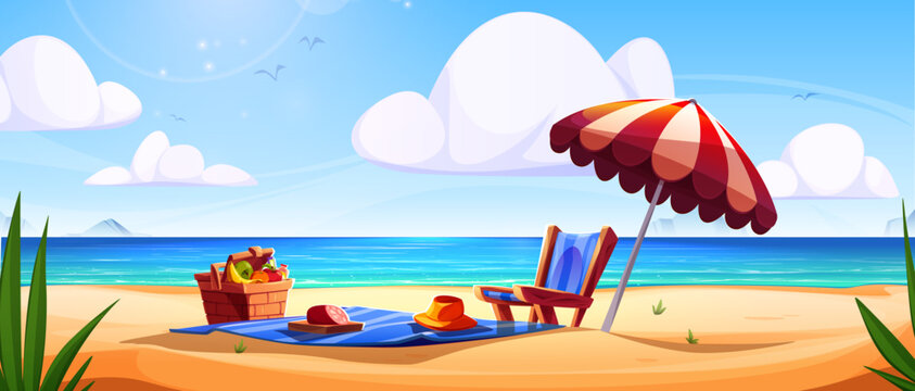 Beach picnic setup with umbrella, lounge chair and wicker basket on sandy shore. Seaside landscape with blue ocean, white clouds and distant mountain. Summer vacation scene with fruits on blue blanket