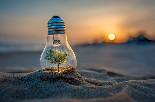 Close-up of a transparent glass Christmas ball on a sandy beach of a tropical sea. Christmas decorations at sunset or sunrise, Christmas and New Year holidays in warm countries, concept. Generative Ai