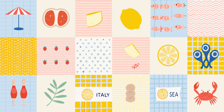 Whimsical collage of summer food beach and italian themed elements in a grid pattern