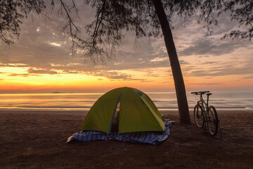 Bicycle parked by a tree and a tent on an empty beach, Wannakorn beach, Petburi province, Thailand
