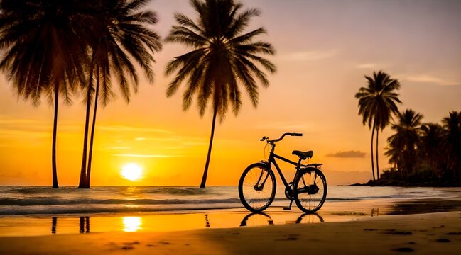 the tranquil beauty of a sunset over the beach with a bicycle, evoking serenity, adventure, and scenic tranquility