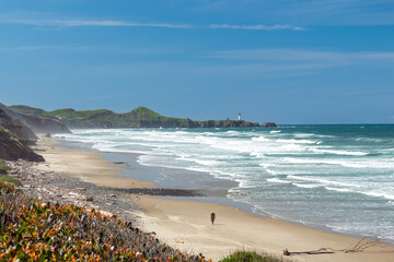 A lone beachcomber on Beverly Beach with Yaquina Head Lighthouse in the background near Newport, Oregon, USA