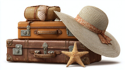 Vintage suitcases, starfish, and sun hat, evoke the spirit of travel and leisure