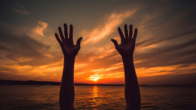 Two raised hands on the beach during sunset.