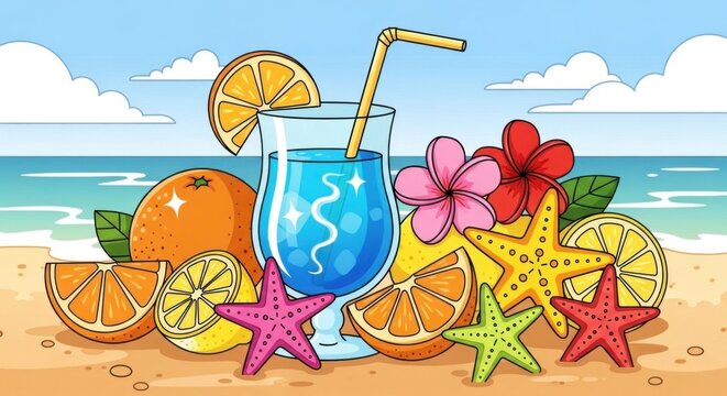 A colorful beach scene with a glass of blue cocktail, starfish, and orange slices on a sandy beach.