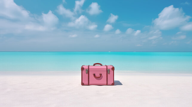 Seaside Escape: Aesthetic Pink Suitcase on White Sandy Beach with Calm Blue Sea and Sunshine