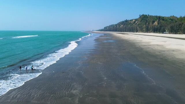 Cox's Bazar, Bangladesh - 20 August 2025: Aerial view of a tranquil beach where the foamy waves meet the sand, where few people enjoy the serene coast.