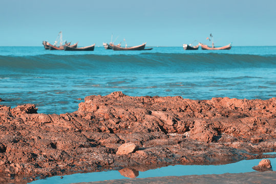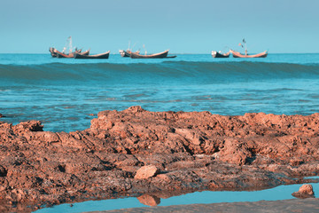 traditional fishing boats at sunset. cox's bazar, bay of bengal, Bangladesh