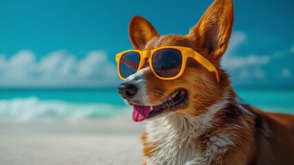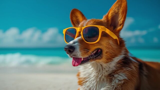 A corgi with brightly yellow sunglasses basks on a sunny beach, turquoise sea stretching to horizon