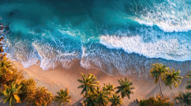 Aerial view of a tropical beach at sunrise with palm trees and clear blue waves, ultra wide angle, serene atmosphere, photorealistic, vibrant colors