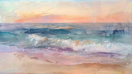 A mixed media collage made with soft pastel pieces depicting a peaceful beachscape with a pastelcolored sunset and gentle waves crashing on the shore.