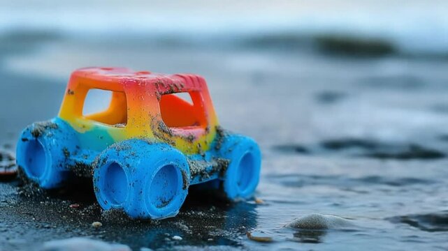 Colorful plastic toy car stranded on wet sandy beach with gentle waves lapping at its wheels