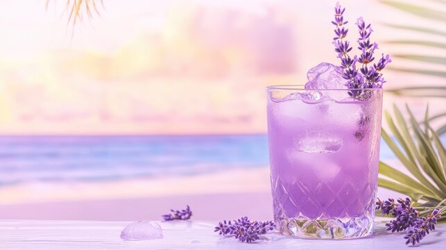 Pastel purple cocktail in a highball glass with floating lavender flowers, placed on a tropical beachside setting