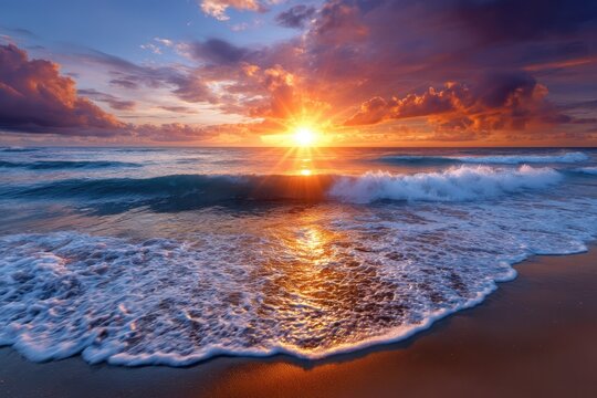 Beautiful sunset over the ocean with waves at the shoreline during golden hour