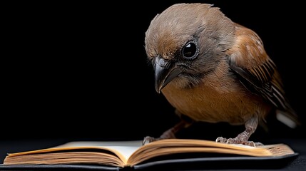 A Tiny Scholar: A curious and attentive bird perches on a weathered book, its beady eyes focused intently on the open pages, suggesting a love for learning and a thirst for knowledge.