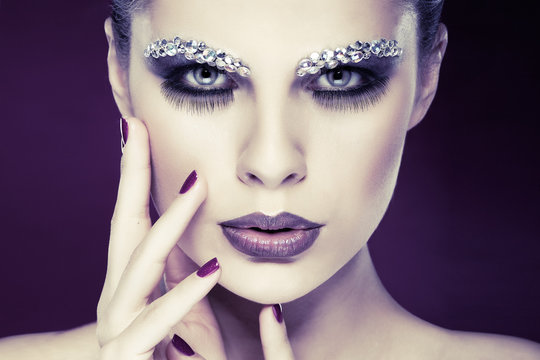 Adult female hands with long square ombre manicured nails, with beady eyes making funny meme gestures. Isolated cutout on a transparent background.
