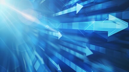 Multiple blue arrows pointing right, with light rays on a futuristic blue background. Concept of progress and direction
